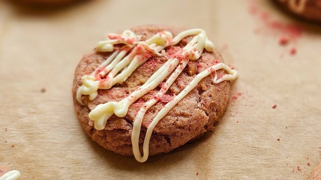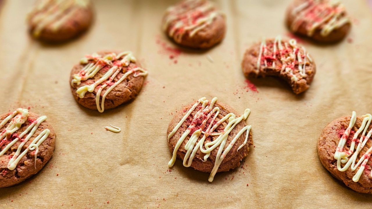 - Melt the white chocolate and transfer to a piping bag. Use some scissors to cut a small opening at the tip of the piping bag and pipe lines of white chocolate over the surface of the cookies and finish with a sprinkle of strawberry powder over the top.